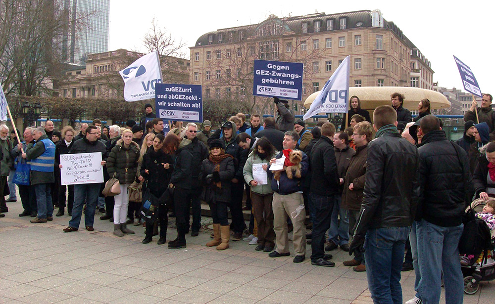 Von der PDV hört der Bürger eher wenig in den gängigen Medien. Anfang des Jahres hatte die Partei allerdings auch dort mit ihrer GEZ-Aktion für Aufsehen gesorgt. Hier wurde von einem der Mitglieder durch eine Online-Petition eine beachtliche Anzahl an Unterschriften gesammelt, in einer deutschlandweiten Aktion gingen die Menschen im März 2013 auf die Straße, um gegen den neuen Rundfunkbeitrag zu demonstrieren. Wir waren bei den Protesten in Frankfurt vor Ort und haben mit den Verantwortlichen gesprochen. Mittlerweile soll laut Angaben des Petitions-Initiators ein Volksbegehren in Bayern in Vorbereitung sein.